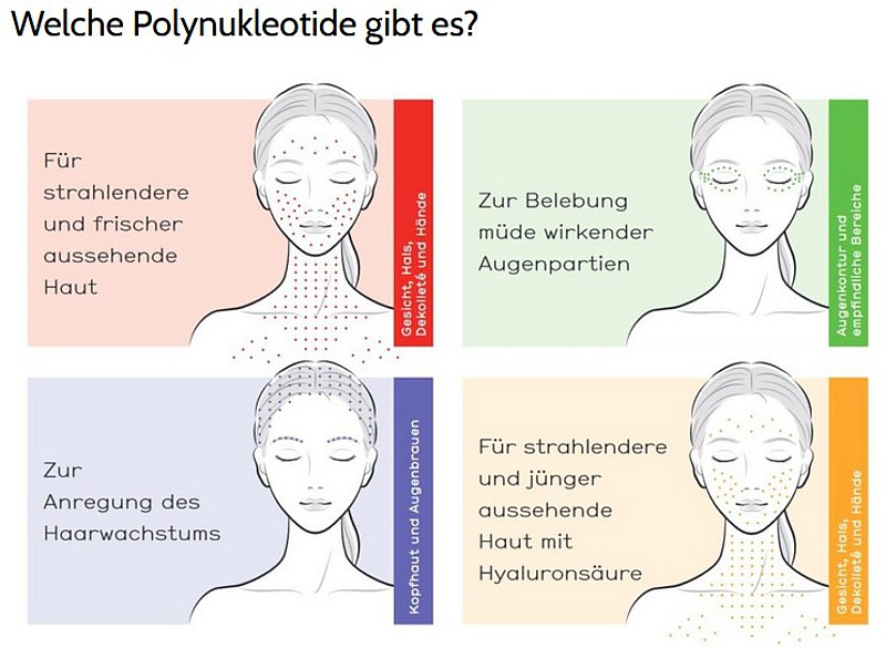 Anders als Filler haben sie nicht vorrangig einen Volumenaufbau zum Ziel. Als Bestandteile der DNA aktivieren Polynukleotide die körpereigenen Regenerations-Prozesse der Haut auf sanfte Weise, steigern die Hydration und stimulieren die Produktion von Kollagen und Elastin, was zu einer nachhaltigen Verbesserung des Hautbildes und zu einer Reduzierung von Fältchen führt.